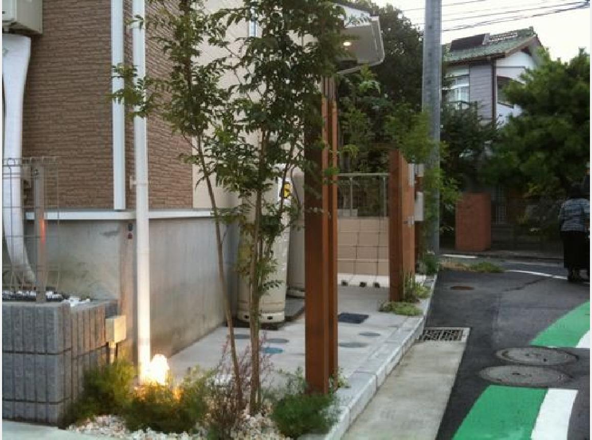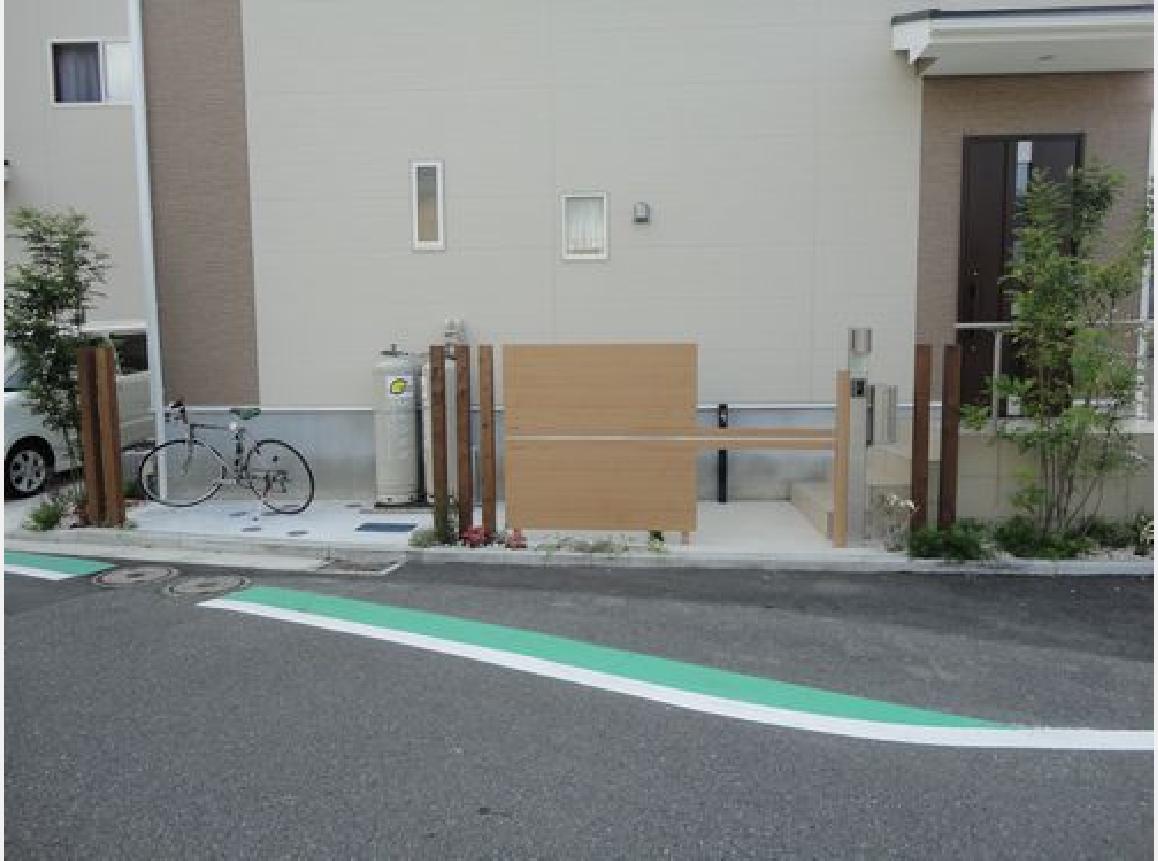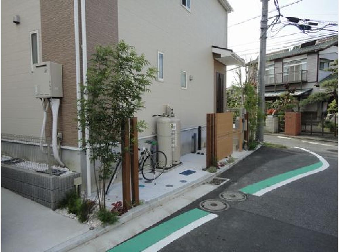 階段しかなかったアプローチ、道路沿いなのに殺風景。狭いスペースに自転車置き場と門扉がご要望でした。